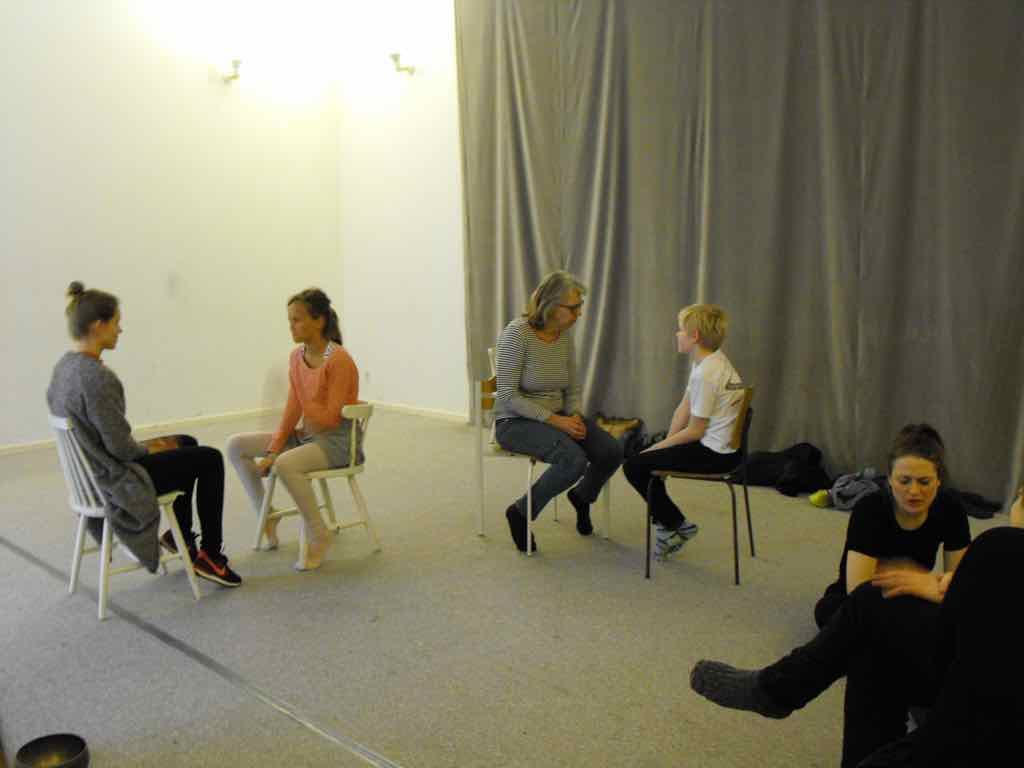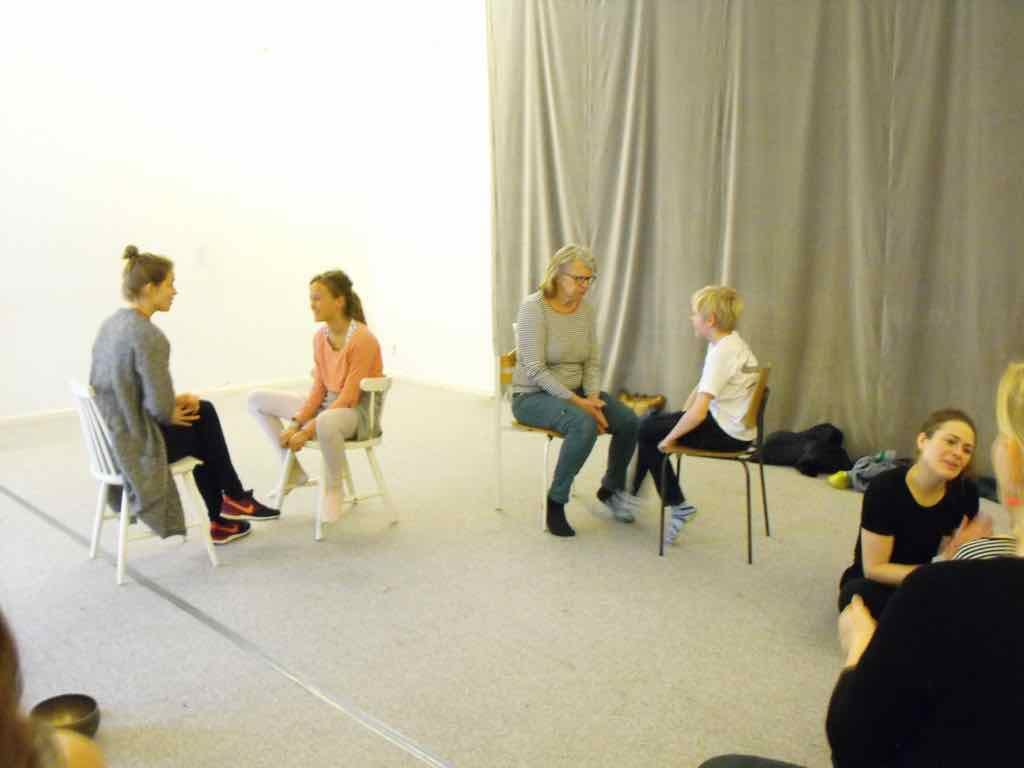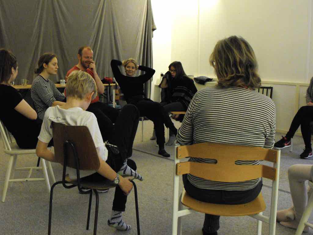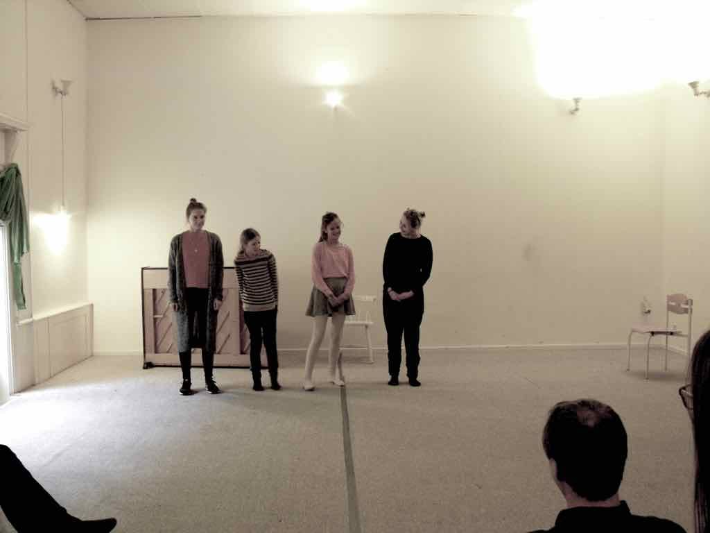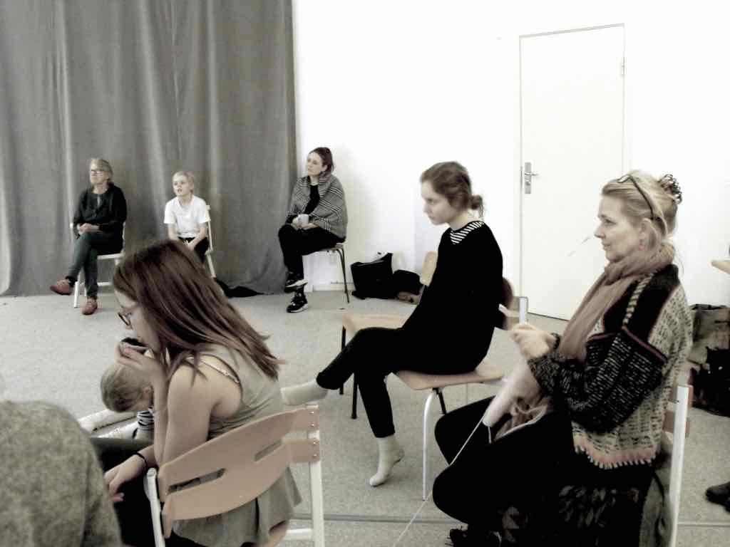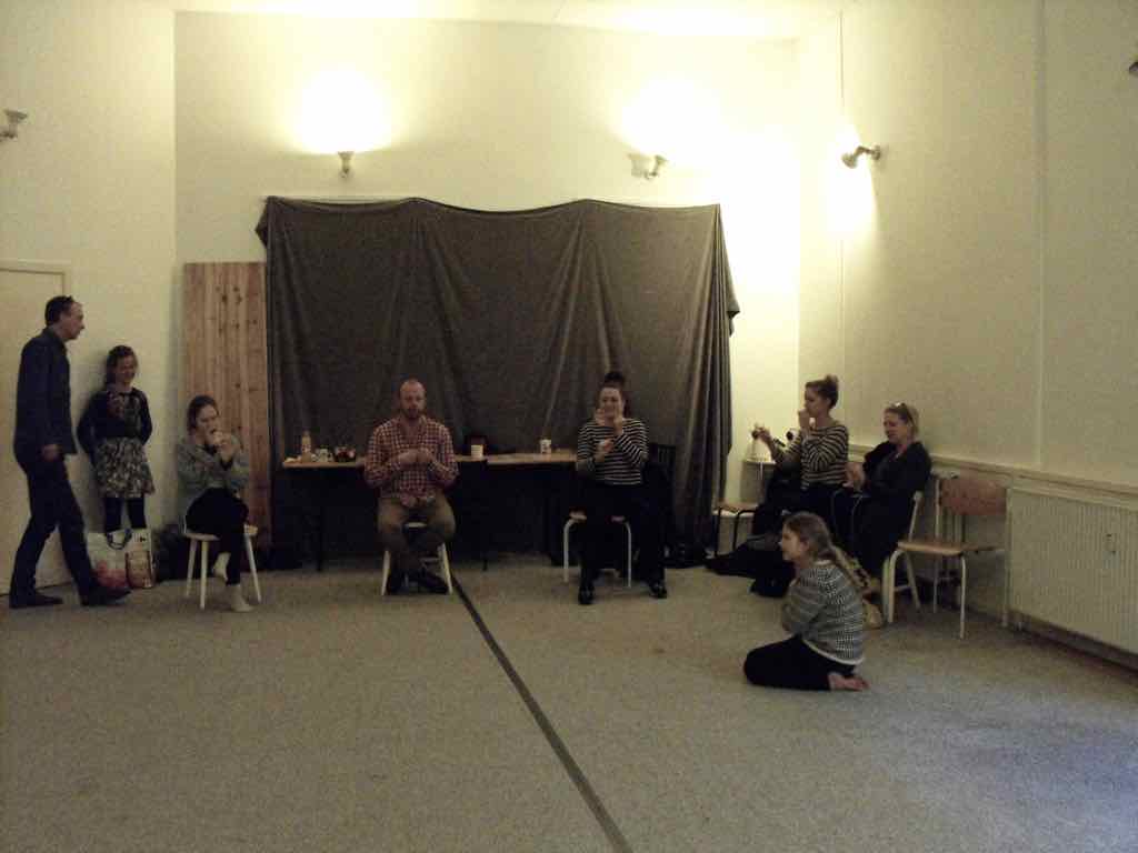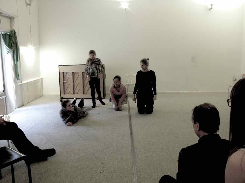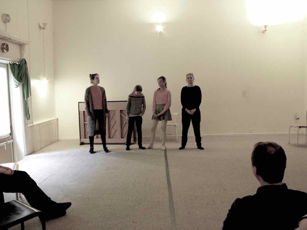 Der er visning i den store gruppe på de fire forskellige fortællinger, som har vidt forskellige udtryk. Processen har været legende, alvorlig og nydelsesfuld for alle deltagerne.