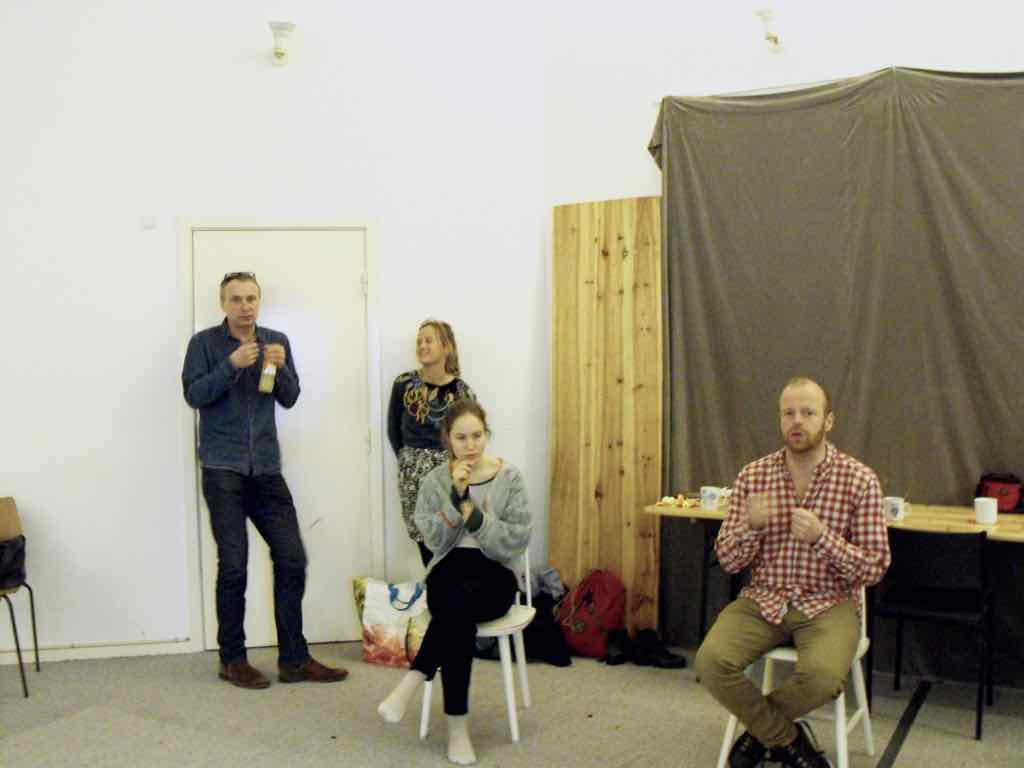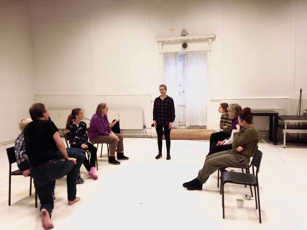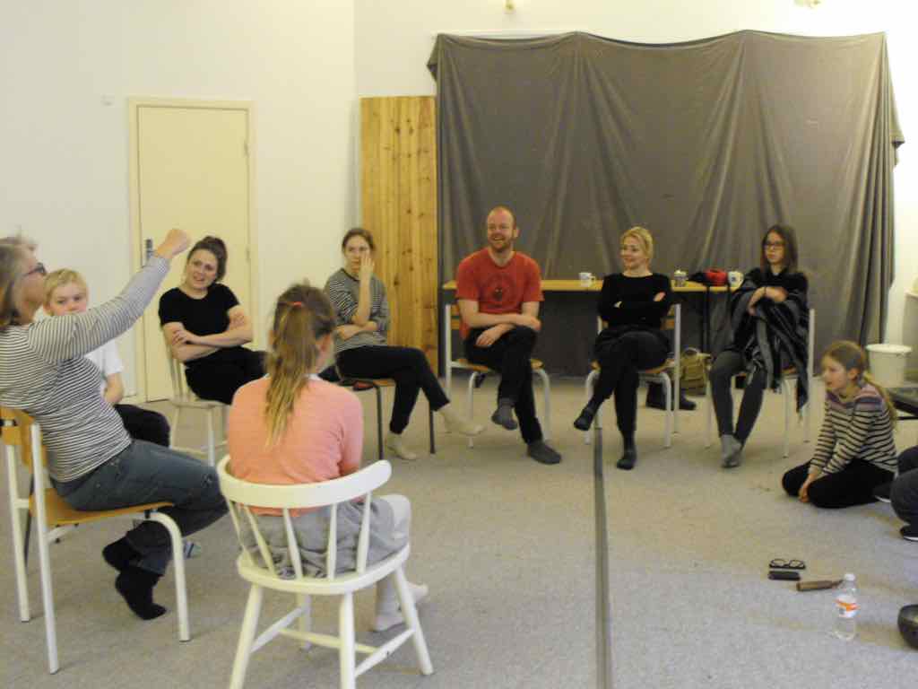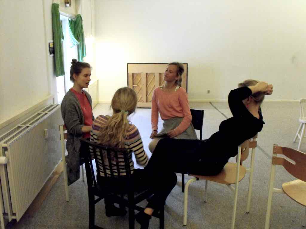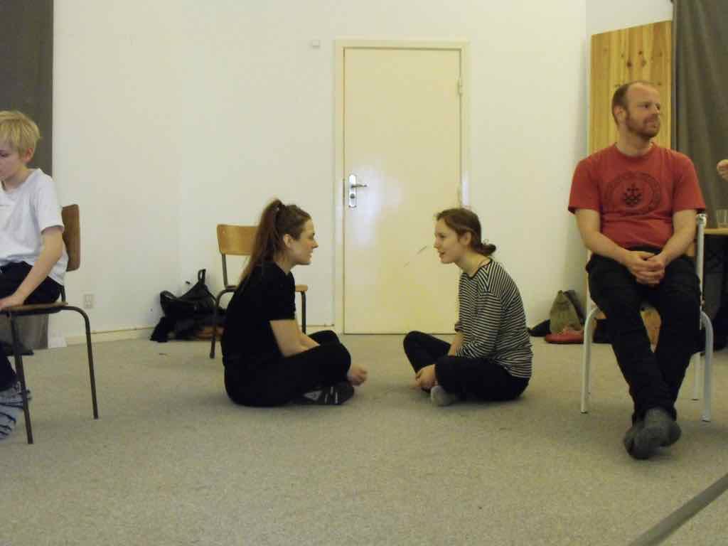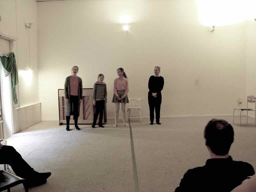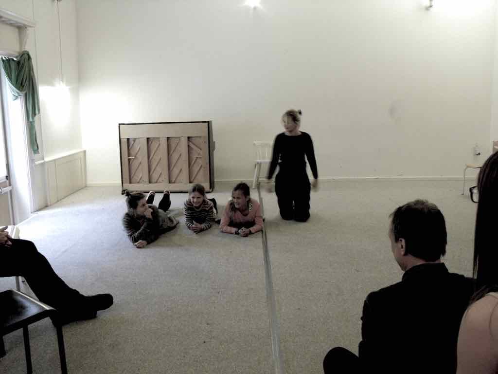 Der er visning i den store gruppe på de fire forskellige fortællinger, som har vidt forskellige udtryk. Processen har været legende, alvorlig og nydelsesfuld for alle deltagerne.