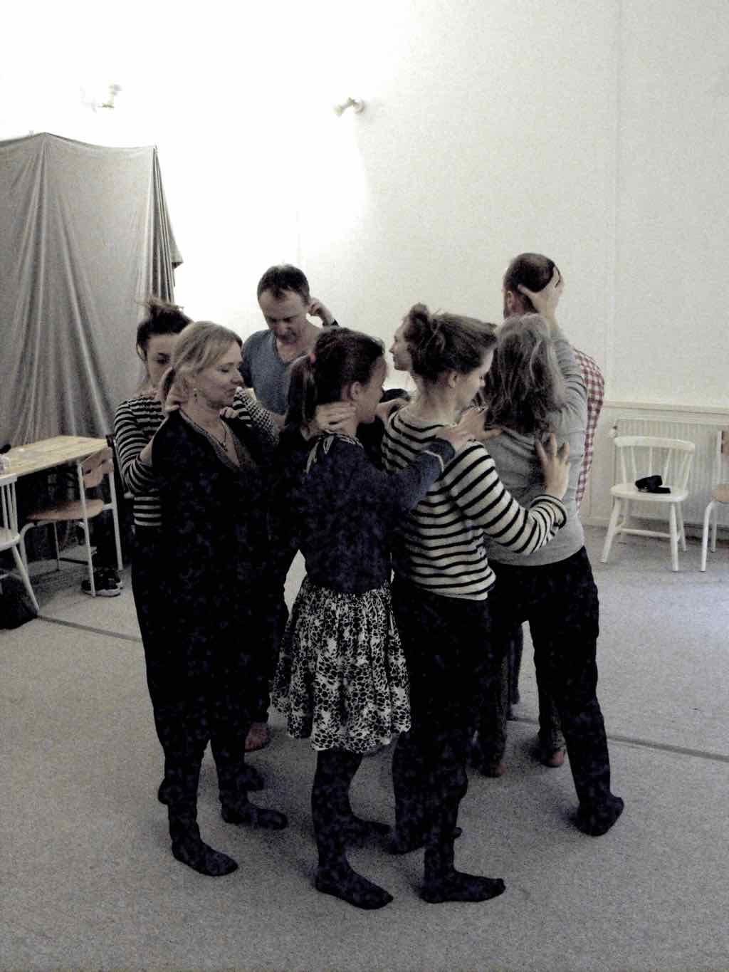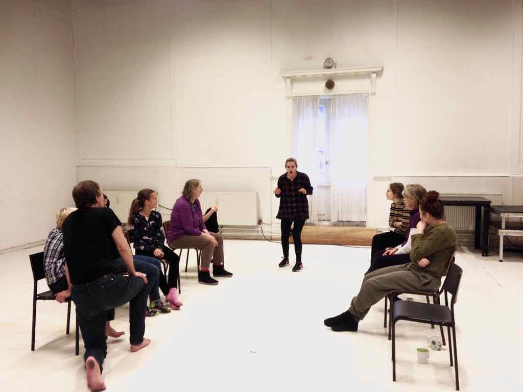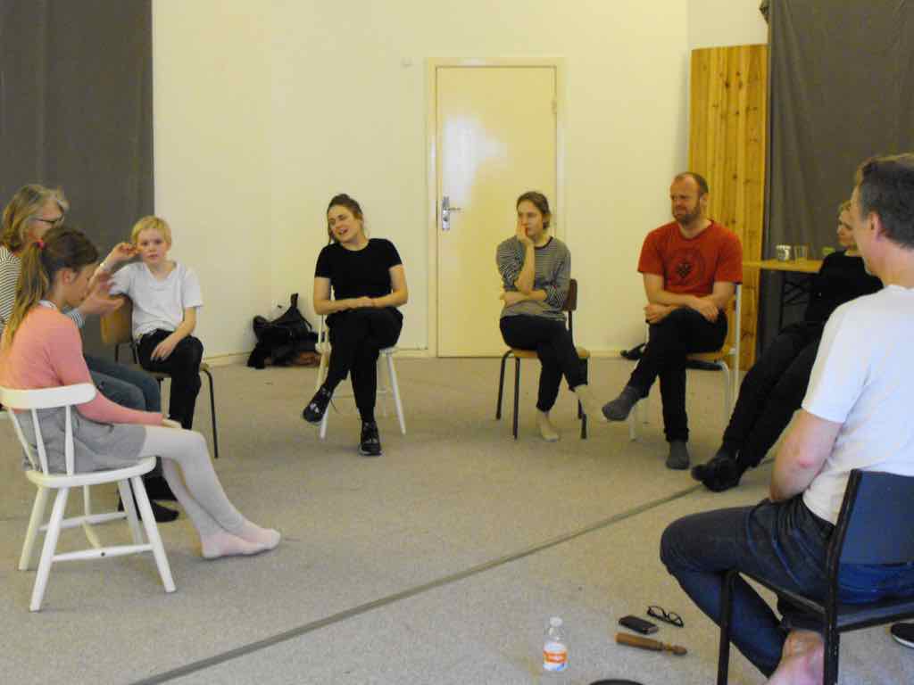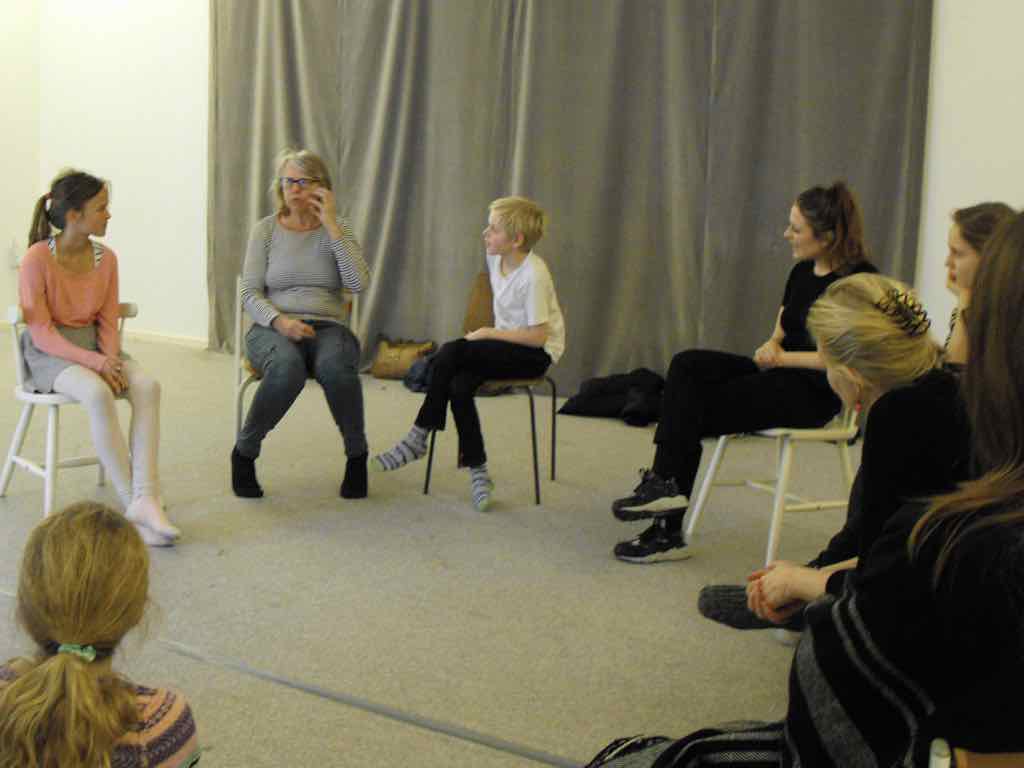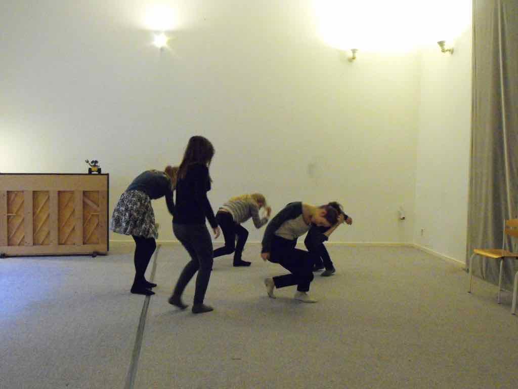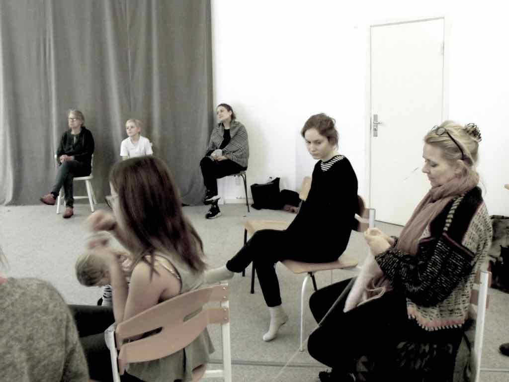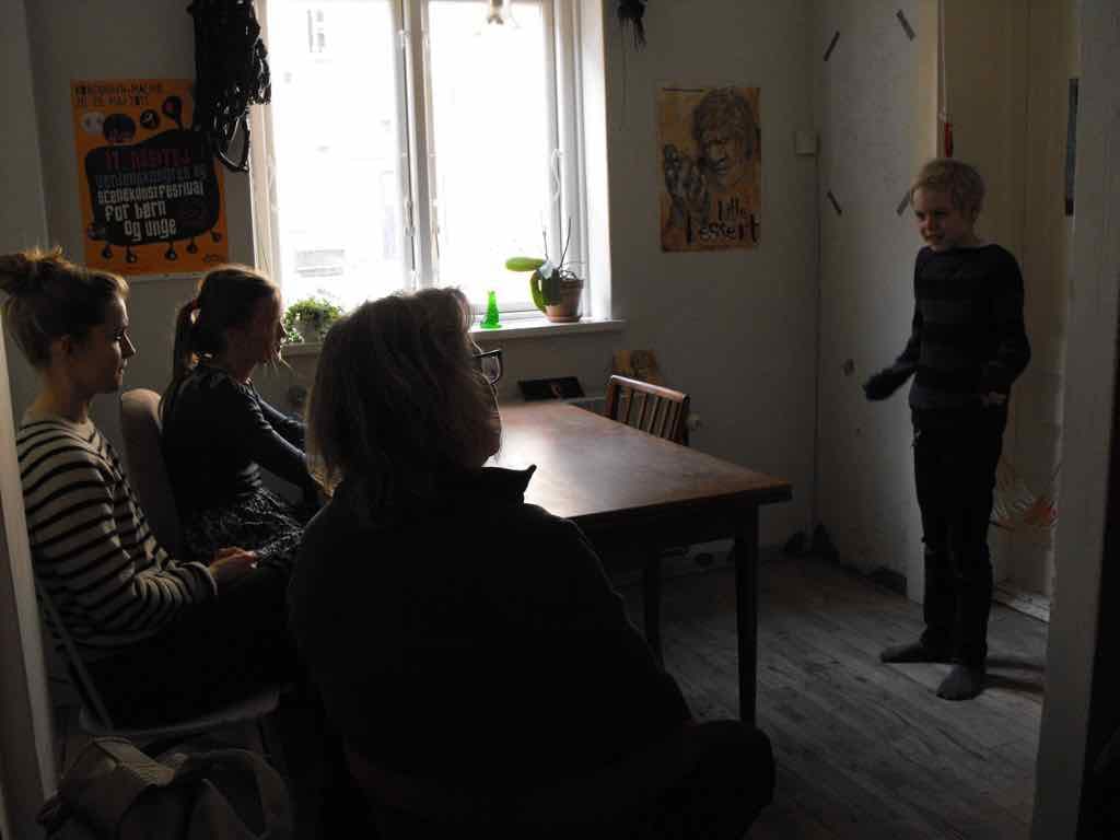 Der er visning i den store gruppe på de fire forskellige fortællinger, som har vidt forskellige udtryk. Processen har været legende, alvorlig og nydelsesfuld for alle deltagerne.
