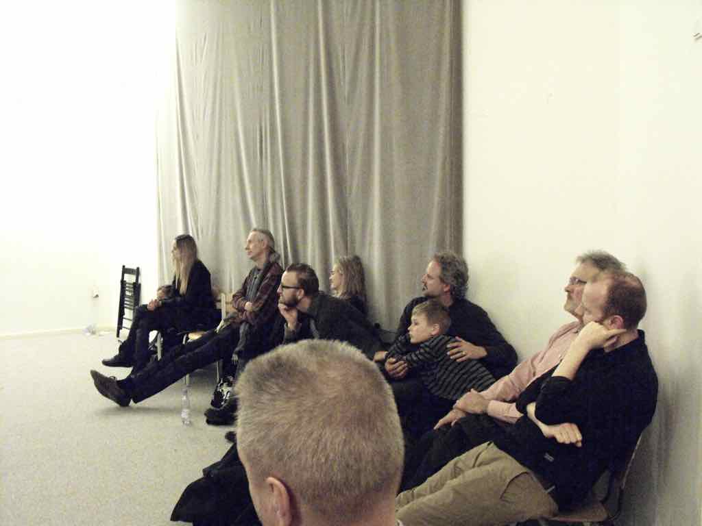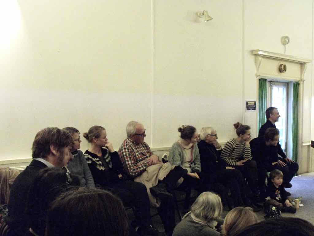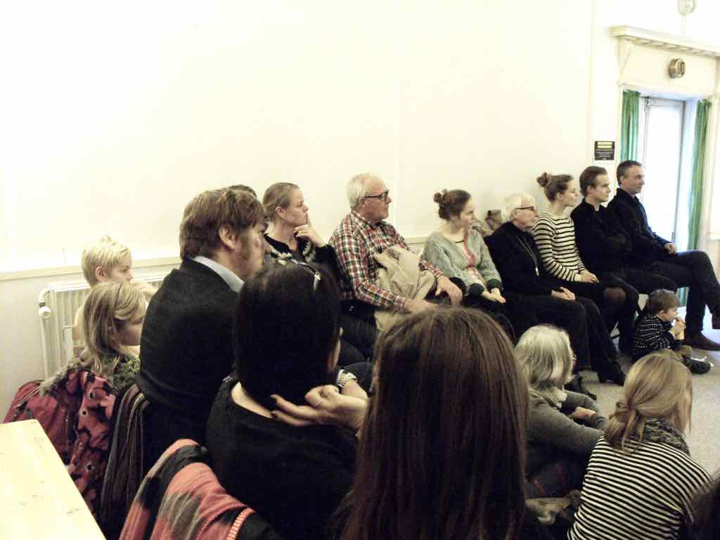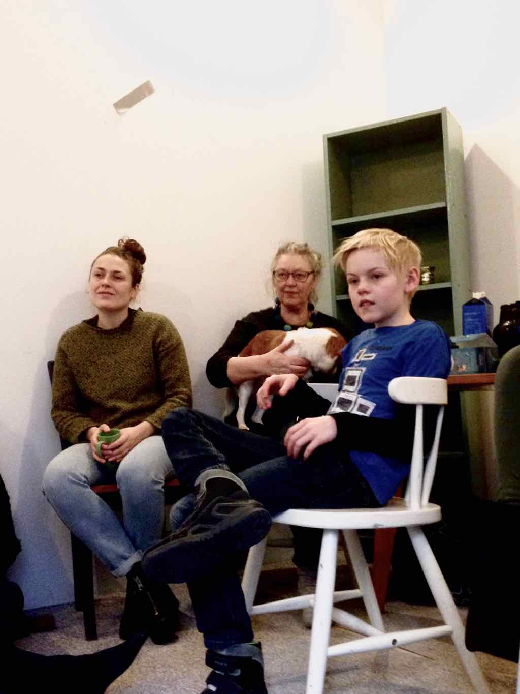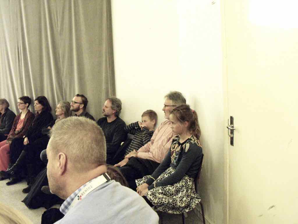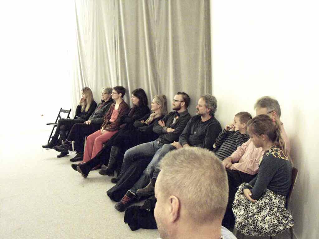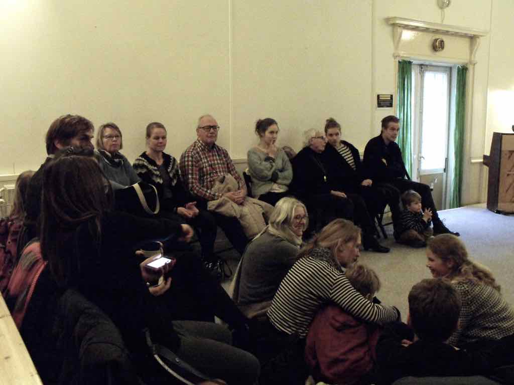 Der er et stort opbud af gæster og langt de fleste af deltagerne har valgt at dele deres fortællinger. Der er en varm stemning, der bærer præg af, at også deltagernes omgivelser har en positiv oplevelse af Story Play fra sidelinjen. Gæsterne repræsenterer også den lodrette tidsakse. Her iblandt er nemlig både søskende store som så, kærester, forældre og bedste-forældre mødt op. Jesper lægger ud med at byde velkommen og introducere Story Play og workshop forløbet og forsøgets undersøgelsesområder. Derefter deler deltagerne deres fortællinger. Det er tydeligt, at deres fortæl-linger og deres optræden har udviklet sig enormt. En enkelt af fællesfortæl-lingerne bliver også delt med gæsterne og de få deltagere, der havde været i tvivl og ikke havde meldt sig til at dele deres fortællinger, beslutter sig også for at dele – blot enkelt . Bagefter er der en lang, engageret og varm fælles snak og refleksion mellem gæster, deltagere og Jesper over fortællingens betydning for mennesket, den lodrette tidsakse og Story Play. Til sidst er der grøntsagssuppe og socialt samvær for dem som har tid og lyst.
