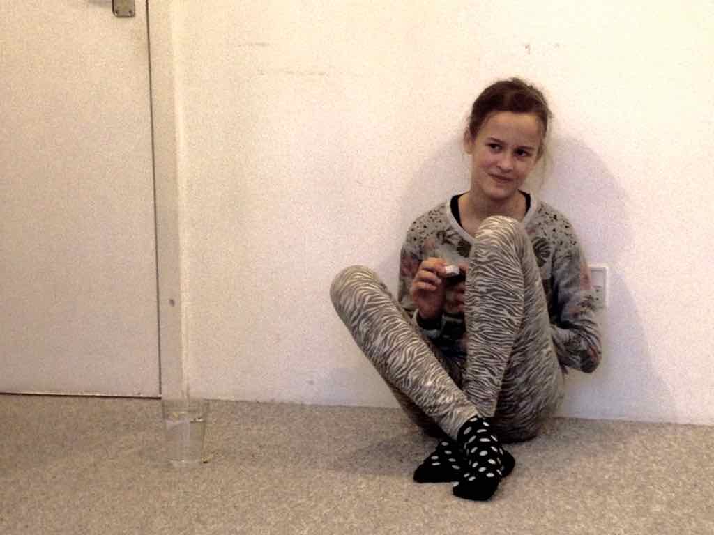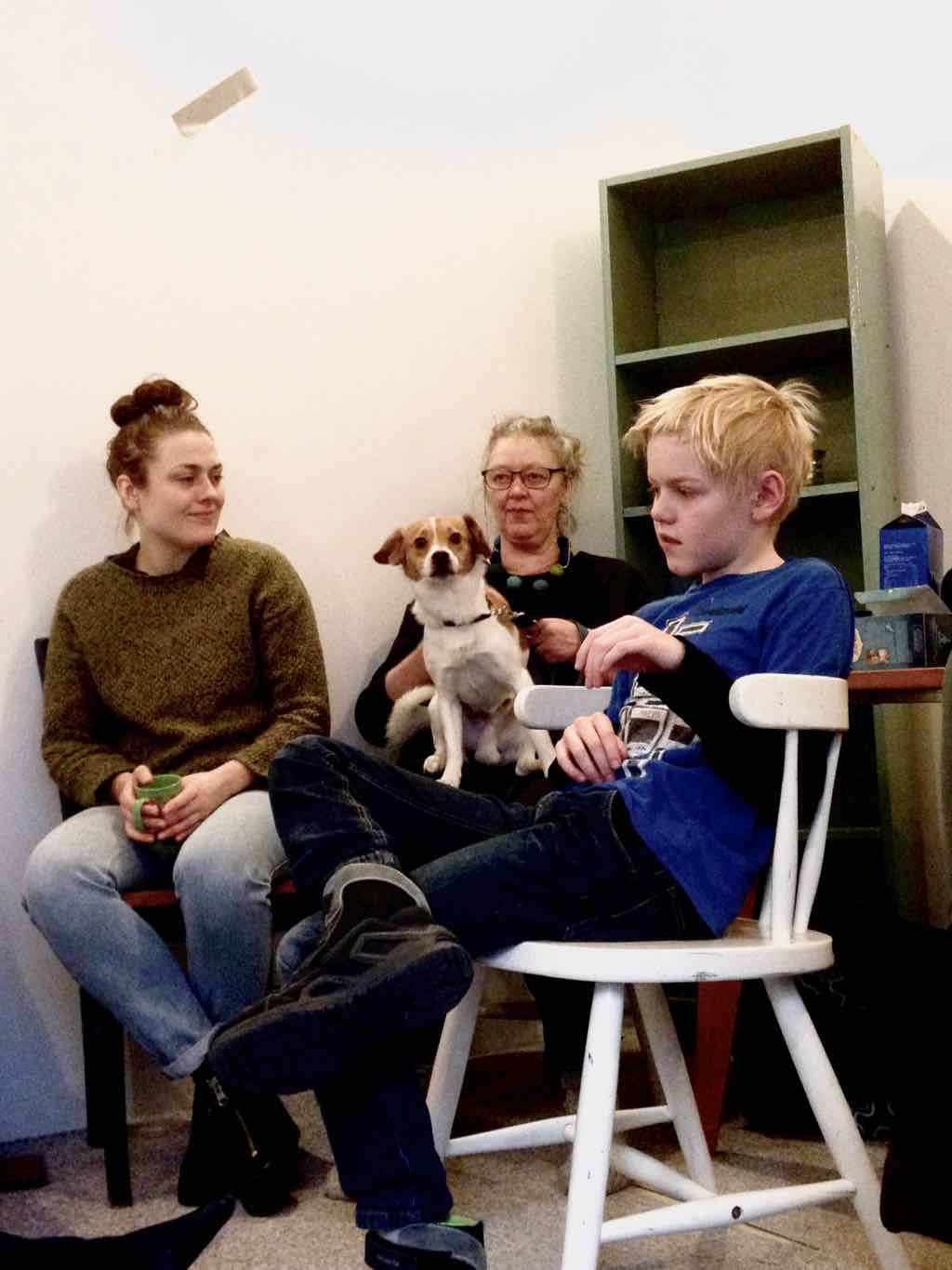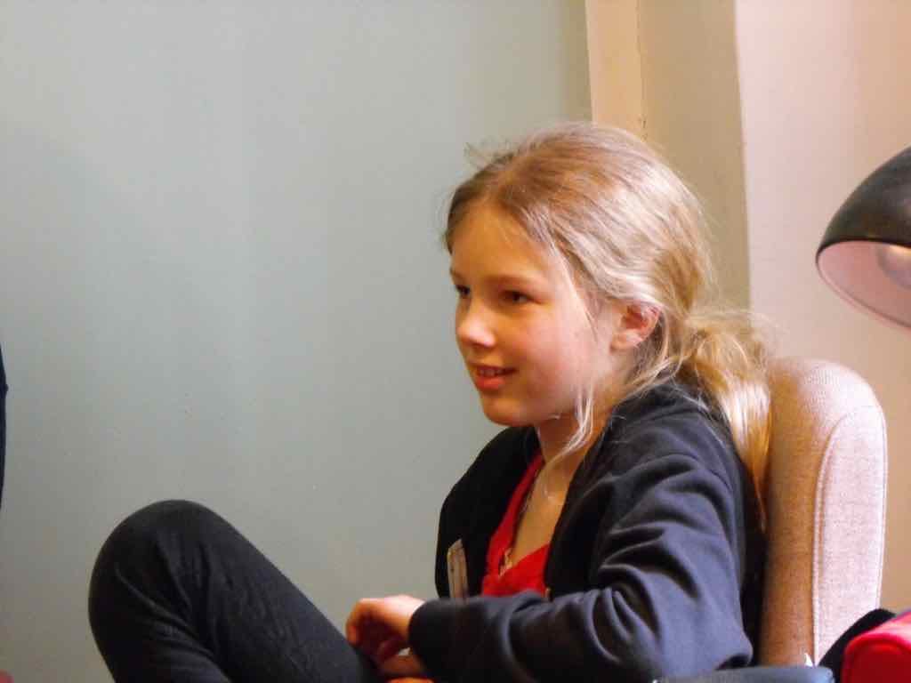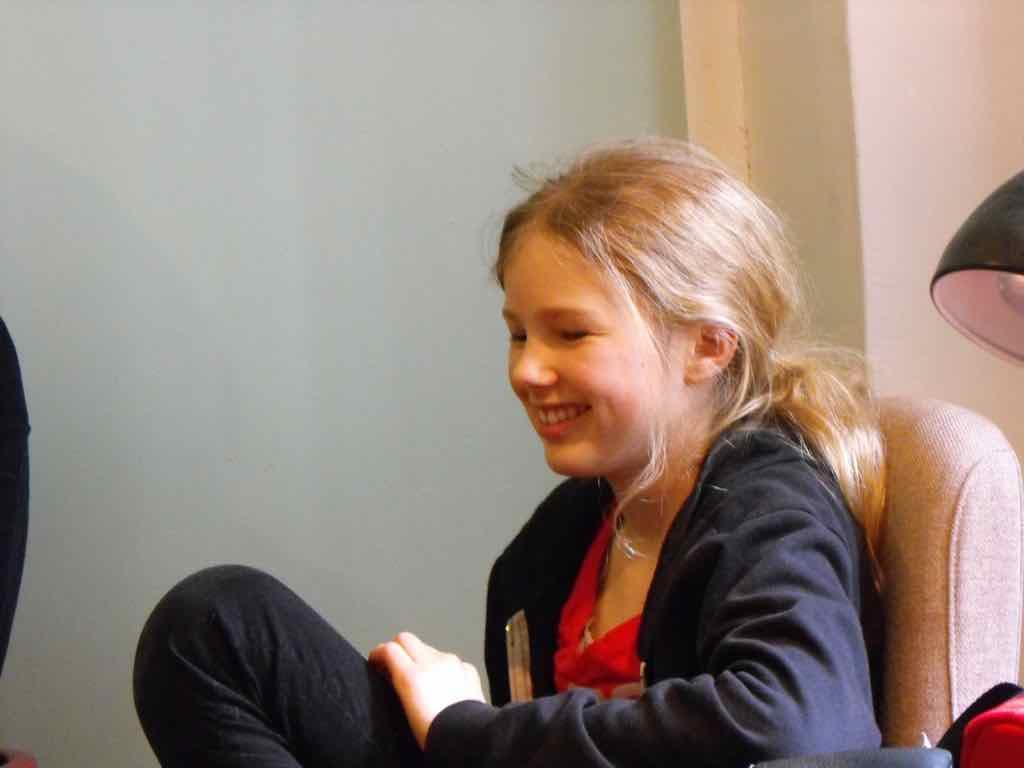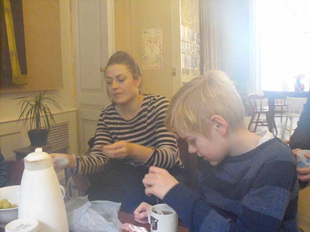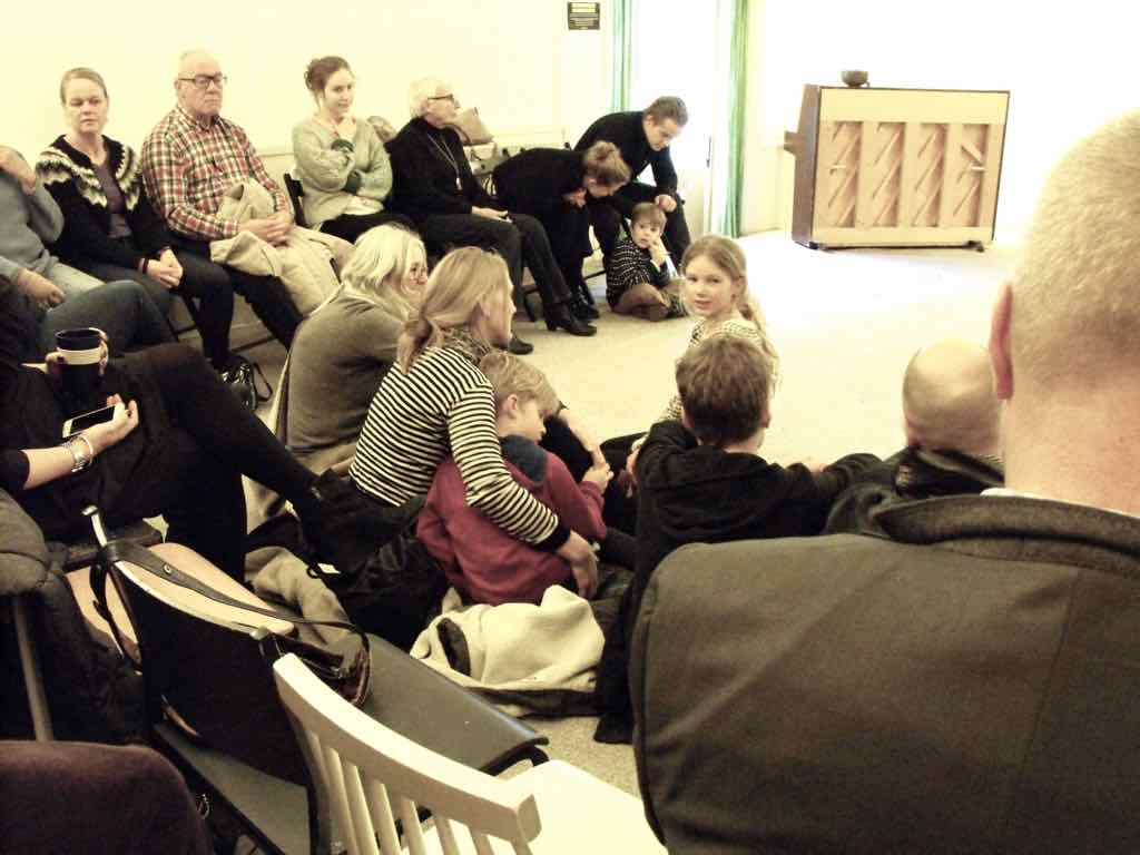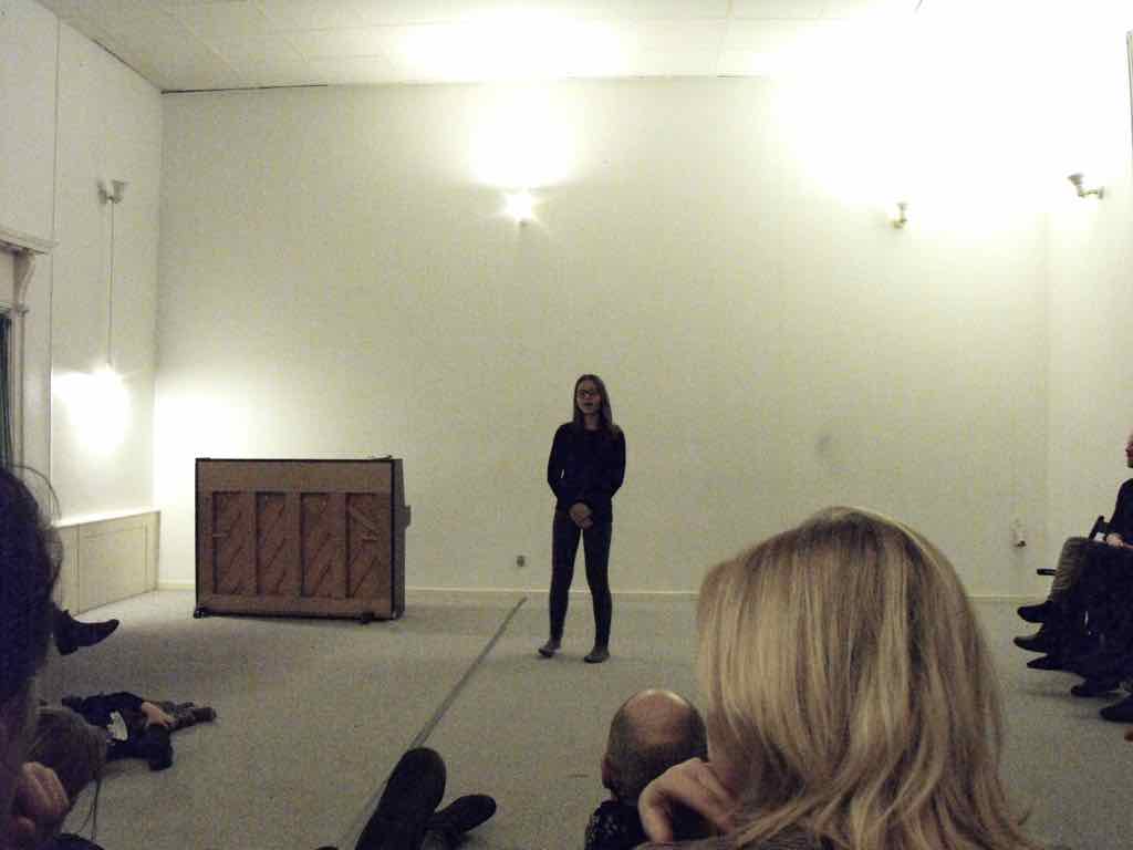 Der er et stort opbud af gæster og langt de fleste af deltagerne har valgt at dele deres fortællinger. Der er en varm stemning, der bærer præg af, at også deltagernes omgivelser har en positiv oplevelse af Story Play fra sidelinjen. Gæsterne repræsenterer også den lodrette tidsakse. Her iblandt er nemlig både søskende store som så, kærester, forældre og bedste-forældre mødt op. Jesper lægger ud med at byde velkommen og introducere Story Play og workshop forløbet og forsøgets undersøgelsesområder. Derefter deler deltagerne deres fortællinger. Det er tydeligt, at deres fortæl-linger og deres optræden har udviklet sig enormt. En enkelt af fællesfortæl-lingerne bliver også delt med gæsterne og de få deltagere, der havde været i tvivl og ikke havde meldt sig til at dele deres fortællinger, beslutter sig også for at dele – blot enkelt . Bagefter er der en lang, engageret og varm fælles snak og refleksion mellem gæster, deltagere og Jesper over fortællingens betydning for mennesket, den lodrette tidsakse og Story Play. Til sidst er der grøntsagssuppe og socialt samvær for dem som har tid og lyst.