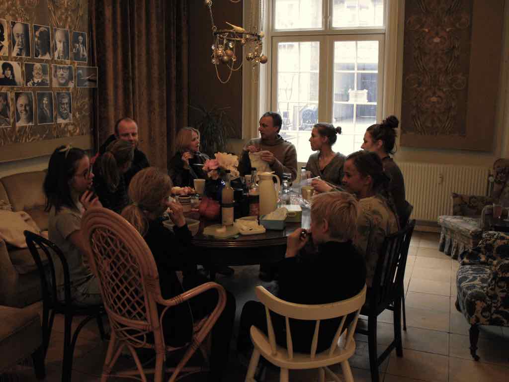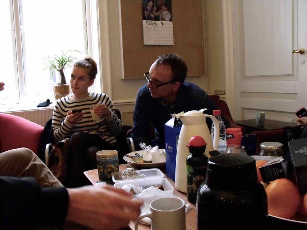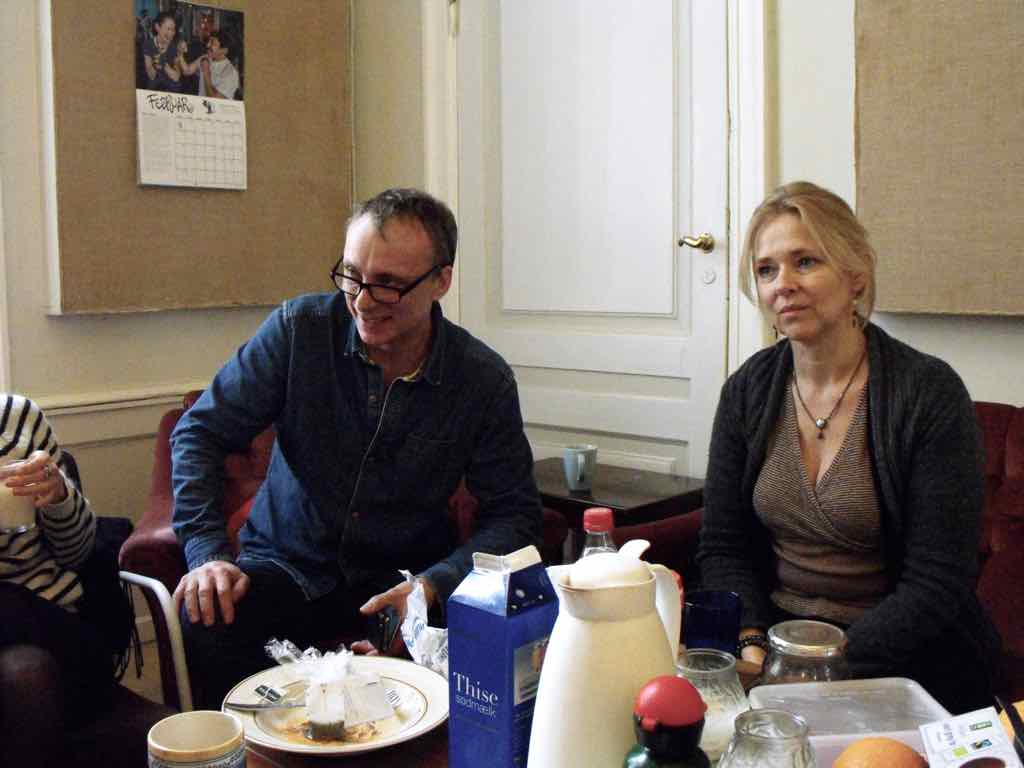 Gruppearbejde med hver enkelts fortælling i mindre grupper i lodret tidsakse i hver sit rum – Jesper roterer mellem de forskellige grupper og giver sit blik på og besyv til arbejdet.